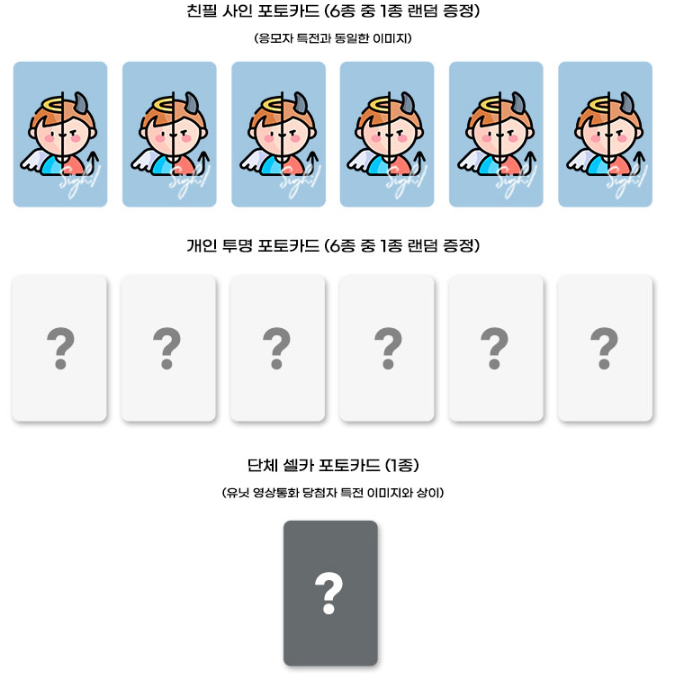 当選者特典→直筆サインフォトカード(全6種、ランダム、応募者特典と同一イメージ)、個人透明フォトカード1枚(全6種、ランダム)、団体セルカフォトカード1枚