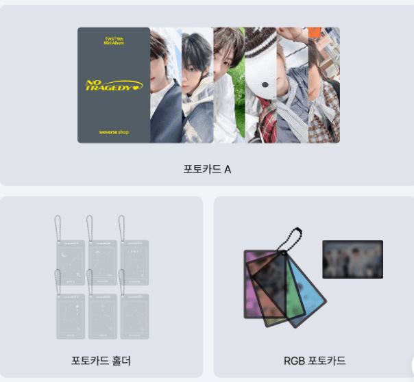 アルバム2枚1セットにつき、未公開フォトカードAver. 2枚(全6種、ランダム)+フォトカードホルダー2個(全6種、ランダム)+RGBフォトカード3種1セット