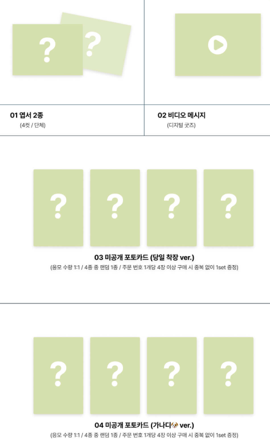 応募者特典→cosmosy pack1点につき、はがき4カット/団体2種、ビデオメッセージ(デジタルグッズ)、未公開フォトカード当日衣装ver.1枚(全4種、ランダム)、未公開フォトカード가나디ver.1枚